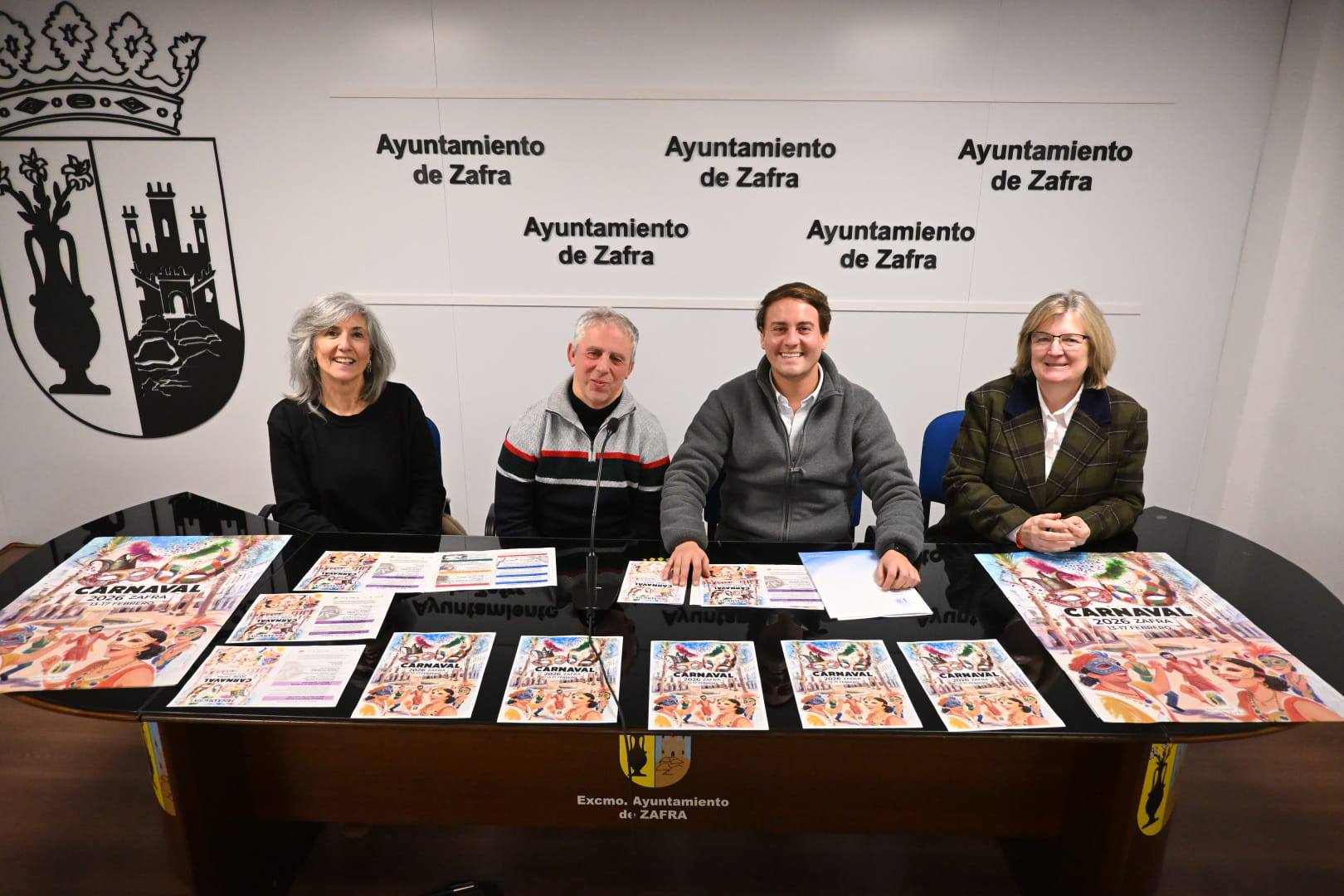 La programación y el cartel oficial han sido presentados este lunes en el ayuntamiento por el concejal de Juventud y Festejos, Alejandro Carvajal; la concejala de Participación Ciudadana, María del Mar Solera; la directora de la Universidad Popular de Zafra, Josefa Moreno, y el pregonero del carnaval, Javier Romero Toro.