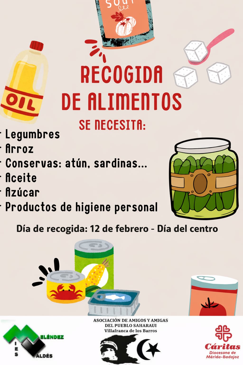 El IES Meléndez Valdés celebrará este 12 de febrero, coincidiendo con el Día del Centro, una recogida solidaria de alimentos y productos de higiene en colaboración con la Asociación de Amigos y Amigas del Pueblo Saharaui de Villafranca de los Barros y Cáritas Diocesana de Mérida-Badajoz.