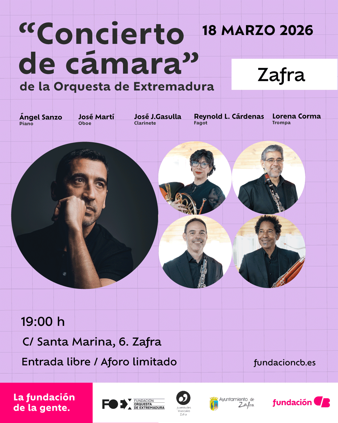 La Orquesta de Extremadura (OEX) ofrecerá el próximo 18 de marzo un concierto de cámara en Zafra, con la participación de un quinteto de viento y piano que interpretará dos destacadas obras del repertorio clásico.