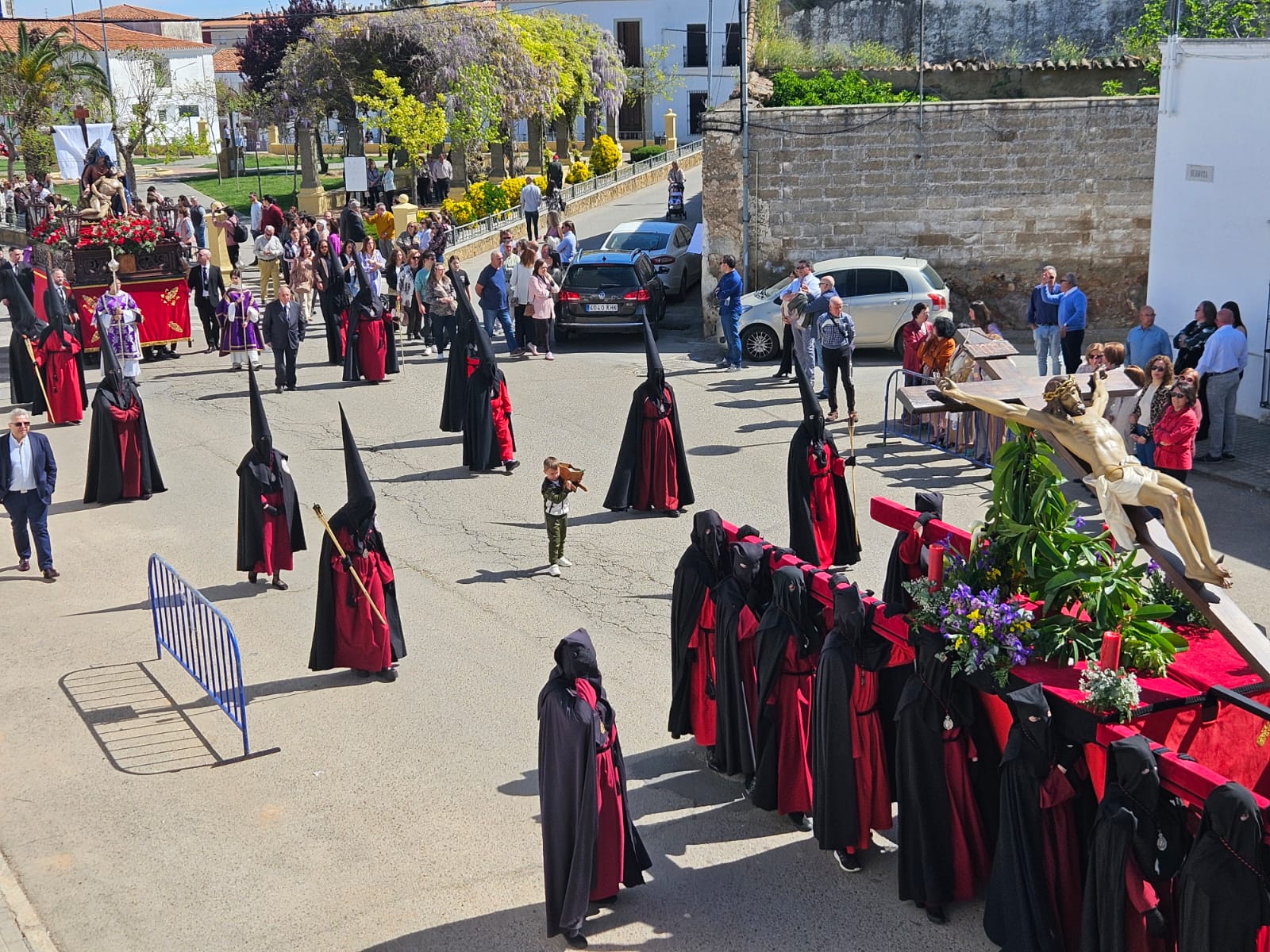 Las procesiones del Viernes Santo en Fuente del Maestre han comenzado en la mañana soleada y calurosa de este 3 de abril con la Carrera Oficial de la Cofradía del Mayor Dolor y el Cristo de la Buena Muerte.