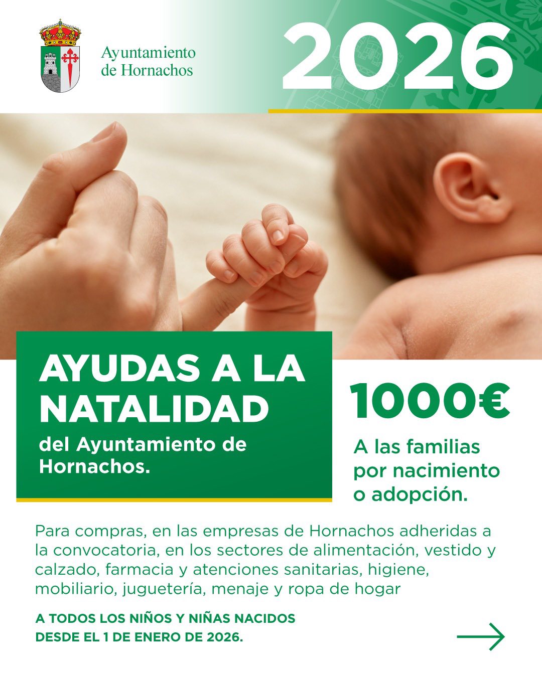 El Ayuntamiento de Hornachos ha puesto en marcha la segunda edición de su programa municipal de ayudas a la natalidad y adopción, correspondiente al ejercicio 2026, con una subvención de 1.000 euros por cada hijo o hija nacido o adoptado en el municipio.