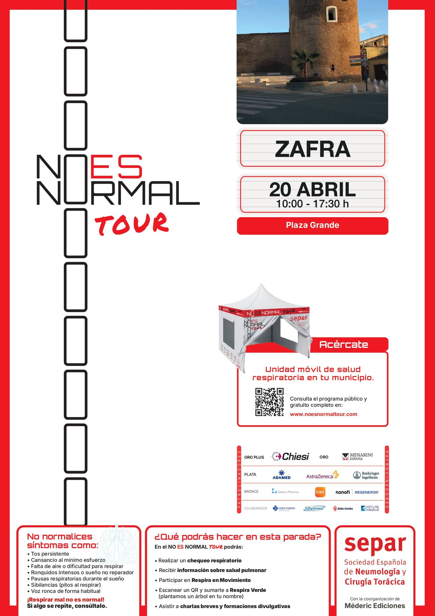 Zafra será una de las próximas paradas del ‘No Es Normal Tour’, una iniciativa impulsada por la Sociedad Española de Neumología y Cirugía Torácica que recorre distintas ciudades españolas con el objetivo de concienciar sobre la salud respiratoria y facilitar el acceso a pruebas preventivas.