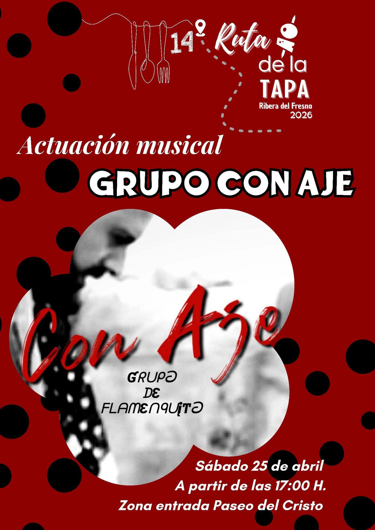Como complemento a la ruta, el sábado 25 de abril tendrá lugar una actuación musical del grupo de flamenco pop ‘Con Aje’, que amenizará la jornada en la zona de entrada del Paseo del Cristo. Esta actividad cuenta con la colaboración de los establecimientos participantes y diversas empresas locales.