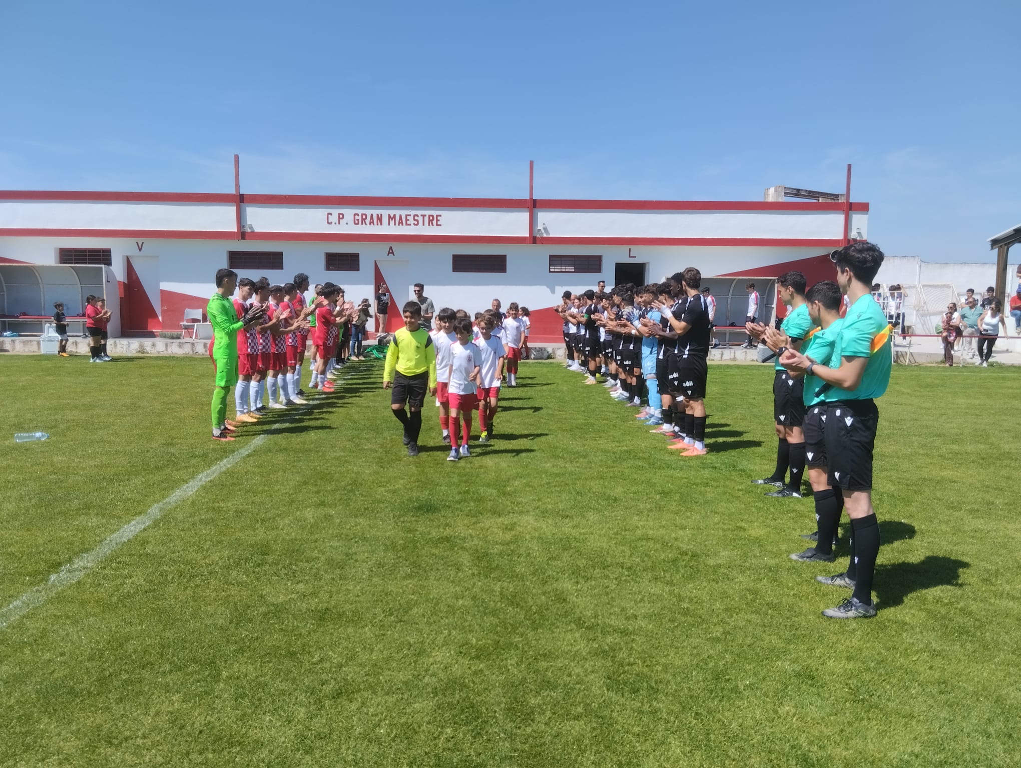 Además, hubo otro momento muy emotivo, ya que los dos clubes hicieron un pasillo al equipo cadete de fútbol 11 del Gran Maestre, campeón de liga del grupo 7 de la Segunda División Extremeña Cadete, así como al equipo benjamín A de fútbol 8 que, por primera vez, disputará la Copa de Campeones de su liga.